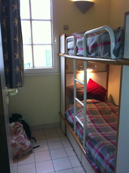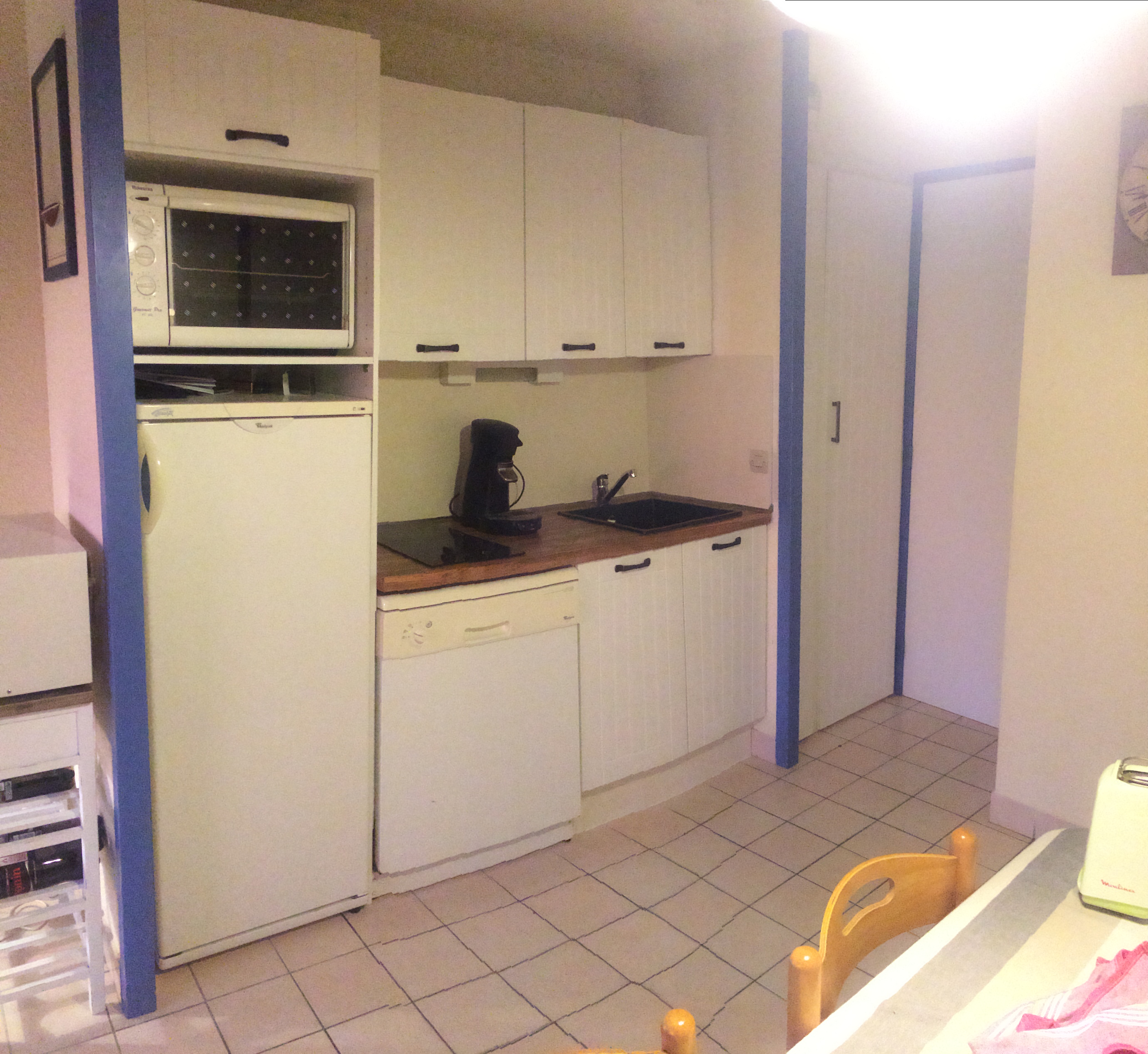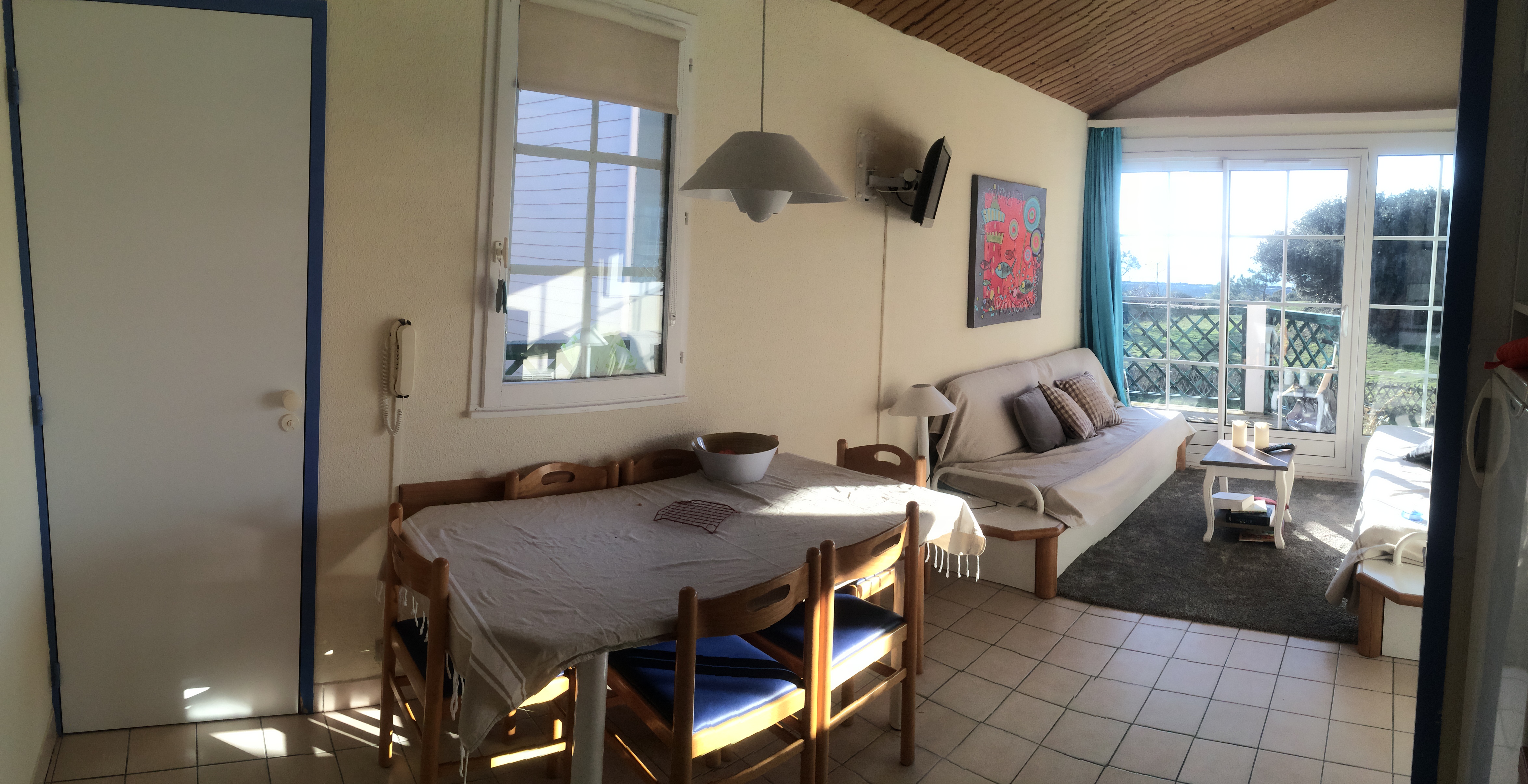 La pièce principale est constituée d’un coin cuisine tout équipé (four, micro-ondes, lave-vaisselle, grand réfrigérateur avec congélateur,…) et d’un séjour avec 2 banquettes lits simples dont 1 avec lit gigogne, TV écran plat.
